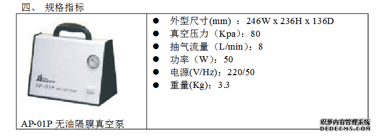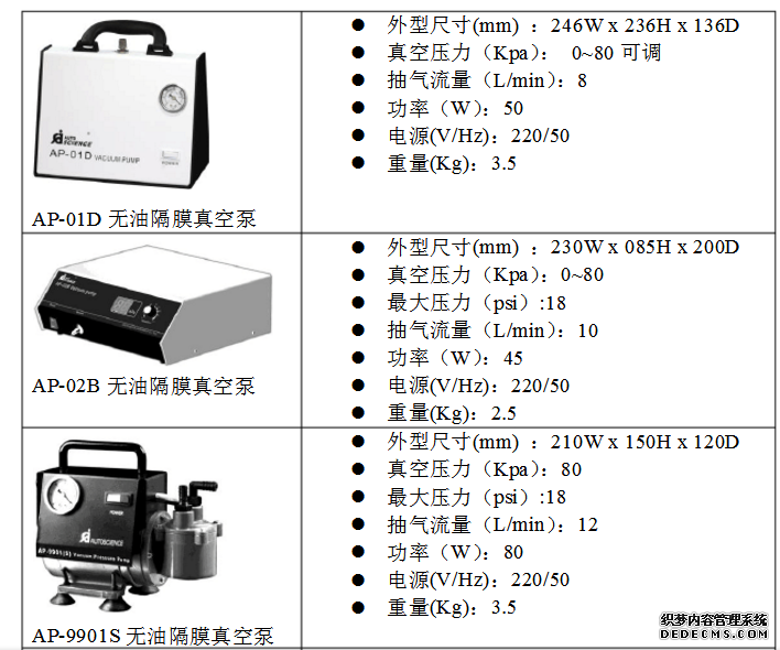 2.為了延伸電機的運用壽命,AP-01P/01D真空泵規(guī)劃有過熱維護功用。為了確保真空泵正常作業(yè),無油真空泵接連作業(yè)時間應(yīng)盡量少于30分鐘。如果泵體過熱無法正常作業(yè),封閉電源開關(guān),待電機溫度降低后,再從頭發(fā)動真空泵。