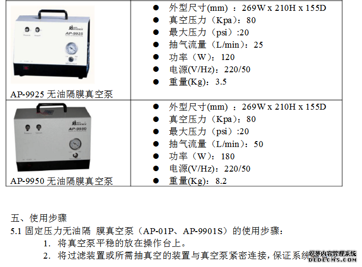 5.2可調(diào)壓力無油隔閡真空泵(AP-01D、AP-02B、AP-9925、AP-9950)的運用過程: