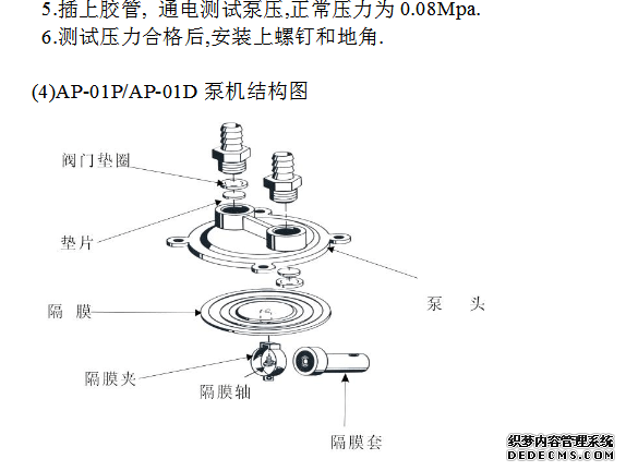5.插上膠管,通電測驗電壓,正常壓力為0.08Mpa.  6.測驗壓力合格后,將螺釘涂上膠,固定上泵體底蓋.